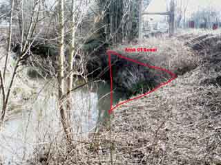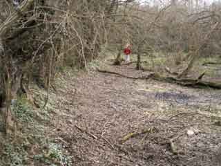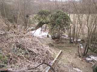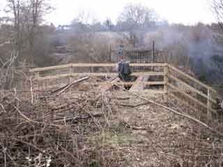 Part of the cleared wood section that will need fencing. Wednesday 31st March Glorious weather. Repaired noticeboard at North Bridge Street after damage from someone who tried to kick it loose. Also tried to scrub graffiti off water tower with limited success. This kind of thing is an upsetting waste of our precious and limited voluntary time. Took lots of structural pictures of first bridge, as it is possible that the whole lot could come crashing down around Southern Water's ears if they try running construction vehicles for the pipeline underneath...as apparently all the plans for reconstruction are back up in the air again. However, had very successful clearance and bonfire in afternoon.