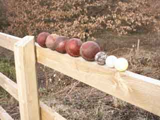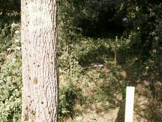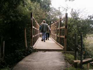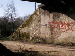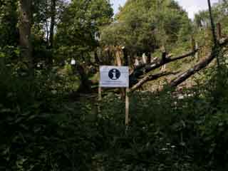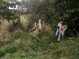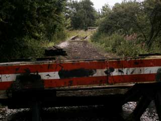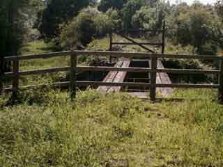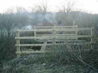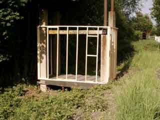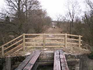Poor condition of crossing gate. Monday 12th April General tidying at station for the model railway exhibition. Sunday 11th April Fencing renewed at station platform. Mowing and general tidying at station for the model railway exhibition. Thursday 8th April I have added a number of pictures to the Miscellaneous section of the pictures. Wednesday 7th April Webmaster not on site - I will let you know what the 'usual suspects' got up to on Sunday! Weather was April mixed bag of sunshine and rain. Sunday 4 April Tried again to remove grafitti from water tower, and first bridge abutements, this time with an electric cordless drill with a rotary wire brush attachment - better, but still far from satisfactory. It is now time to try blow torching the paint, or last resort, spraying over in white. We do not have much of an ongoing graffiti problem, but it is unsightly, and adds an air of menace and dereliction to the village that cannot be tolerated. On a more positive note, commenced clearance of footpath route between first and second bridges. We will need to construct a bridge over the stream, but we have the materials in the shape of sleepers and old bridge girders - it is a 6m gap.
