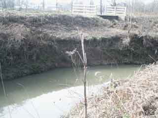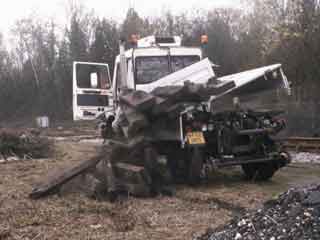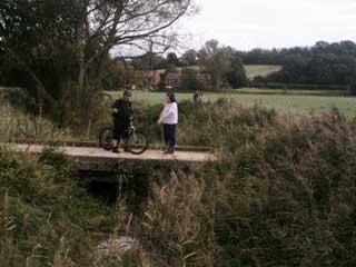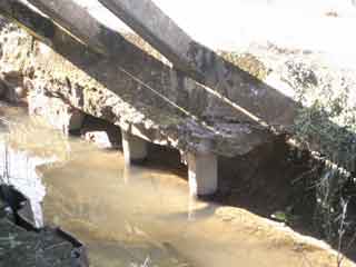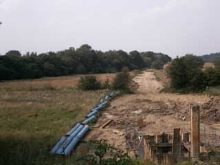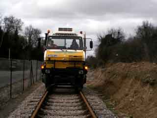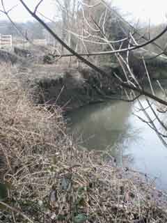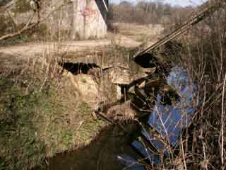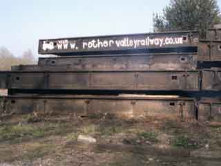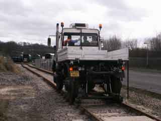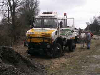 Towards village from 1st bridge. Footpath on right. We will establish a shortcut footpath across the stream in the middle of the picture enabling walkers to shortcut between first and second bridge. Wednesday 24th March Webmaster not on site, but Edith Cavell carriage was transported to Wittersham Road (K&ESR). Apparently this did not happen till late evening, so was completed in the dark! Sunday 21st March A run of bad weather. Small amount of clearance done in morning, including clearing the rest of the ivy from the water tower by North Bridge St. Rained constantly in afternoon so had to sit in the buffet then give up... Wednesday 17th March In contrast to Sunday, this was a great day. Mark Yonge brought some surplus sleepers in from Essex, on a Unimog - a road rail/maintenance vehicle (See pictures below). We will start reconstruction of 5th bridge imminently, although the clearance work has revealed serious erosion of the bank between the mill and the railway embankment between 4th and 5th bridge (see pictures below), this will need to be rectified before trains can run, although hopefully the environment agency should pick up the tab, this damage has been masked by the overgrowth of so many years. Chris and Gemma (webmaster) also surveyed another bridge that had not previously been thought accesible, it is on a landowners property who is not yet 'on side', however my trusty OS Explorer map revealed a public footpath that runs by it, the pictures of this and where trains used to run into the mill have been added to the 'down the line' page, under photos.