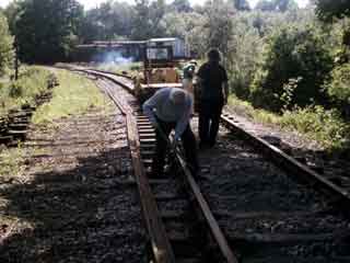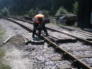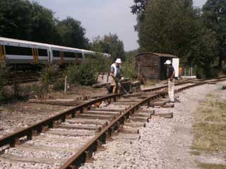 Jamie tightening chair bolts. Wednesday 4 Aug Dug trench in yard to enable instertion of new point timbers under two roads. Recovering errant ballast from near loading pad. Clearing at footbridge site continued.