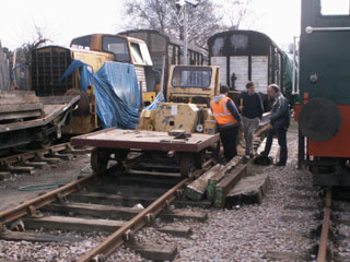 Reconnecting and dropping buffers into place. Wednesday 11th Feb Sleepers moved off from lomac to the station area. Pointwork moved onto matting for repair, and to avoid being lost in the undergrowth yet again. Clearance continues on embankments. Volunteers smell of diesel and woodsmoke!