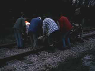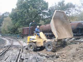 Dumping over the abyss at Oak tree Wednesday 6 Oct Point work in yard. Sunday 3 Oct Rain stopped play - except hardcore donation for platform infill and old bricks. Thursday 30 Sep Receieved a signal post from Canterbury (due to modernisation scheme). Will be used in yard. Sunday 26 Sep Continuation of pointwork in yard. Work started on extending the platform (block laying). RVRSA committee meeting in afternoon. Sunday 12 Sep Sponsored Walk. Left station at 1100. Walkers: (me!) Chris, Jack, Ken, Liz, Roy, John R, John H, Keith, Janet and Jamie (cycling!) and anyone who gave financial support to the walkers.