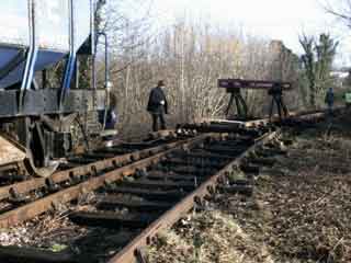 Embankment Clearance continues... Sunday 1 Feb Buffer Relocation, using Titan, and a good sized track gang... All kickback siding keys and fishplates removed, so track between new buffer stop position and first bridge plus kickback siding can be lifted to enable access for Southern Water. A lot of progress today.