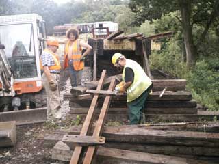 Old meets...old! Sunday 4 July, moved frog (heavy points component) and some point rails onto lomac. Shifted chairs and sleepers off to edge of embankment to allow access towards first bridge.