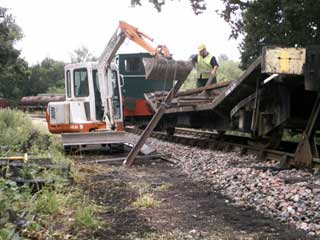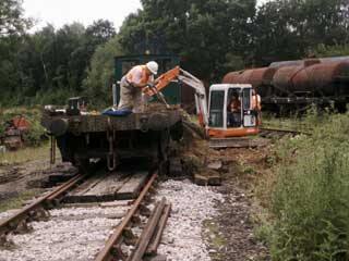 Lifting point sleepers. Tuesday 6th July, webmaster not on site (escaped to London!) but lots of fun had loading last piece of point, then unloading at station end. Unfortunately the mini digger was feeling the strain after that lot! Monday 5th July, continued lifting point rails onto lomac. Finished day with one more to load. Slow progress due to several factors, including getting a genny up and running for angle grinding awkward bolts off, and the sheer difficulty of loading such heavy rail components and making sure that health & safety was observed at all times.